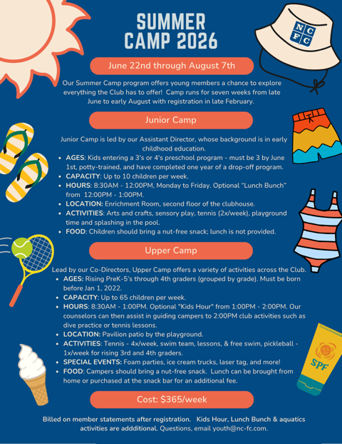 Our summer camp program is a wonderful opportunity for our youngest members to explore everything the Club has to offer! Camp kicks off late June and runs seven weeks until early August. Registration for summer camp opens in February.